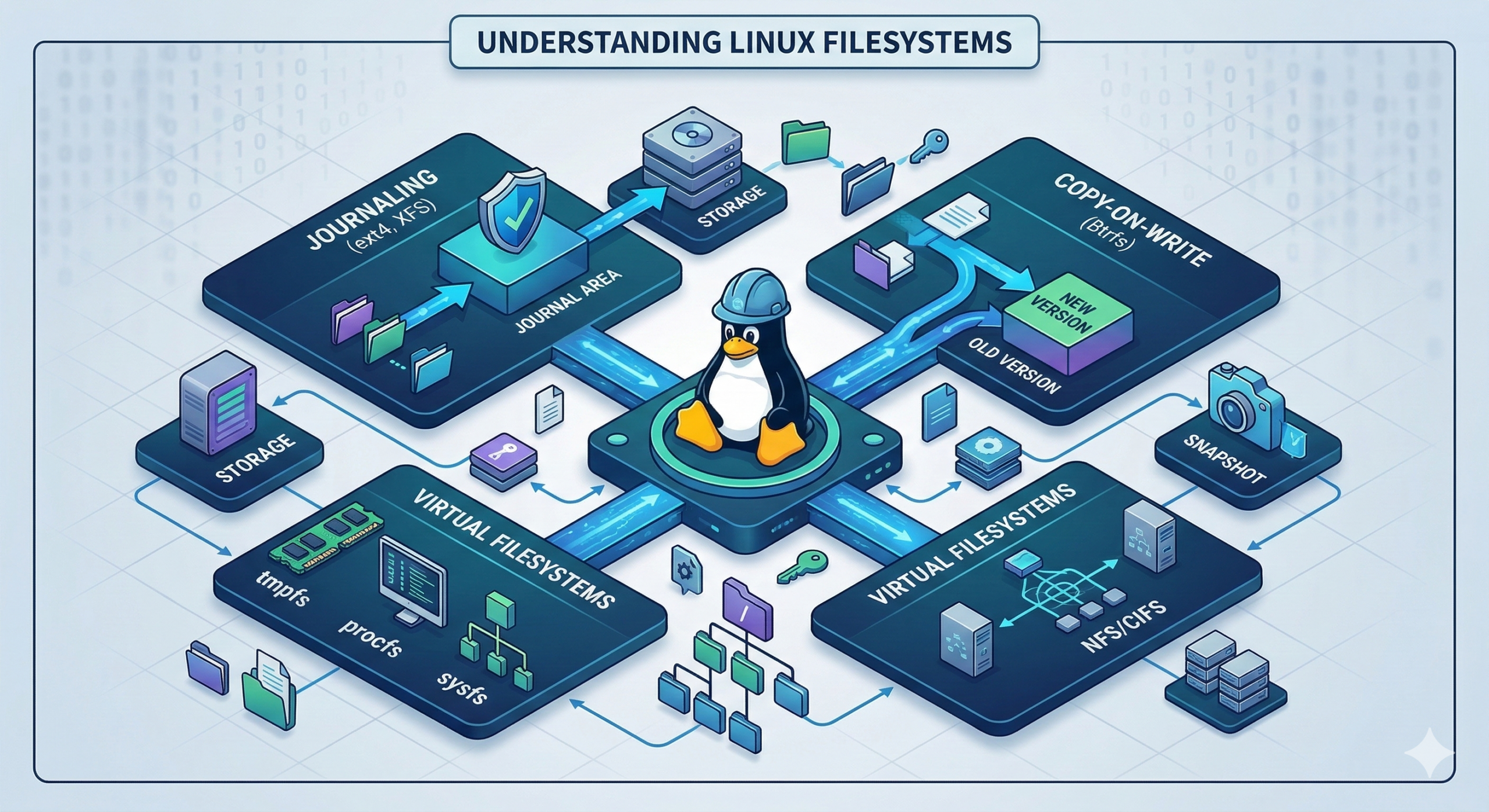 本記事は、書籍『Linuxの仕組み』を読んで学んだことをアウトプットするために作成しました。Linuxのファイルシステムについて、基本的なファイル作成の流れから、データの不整合を防ぐ機能、そして高度な仮想ファイルシステムまで、要点を絞って解説します。